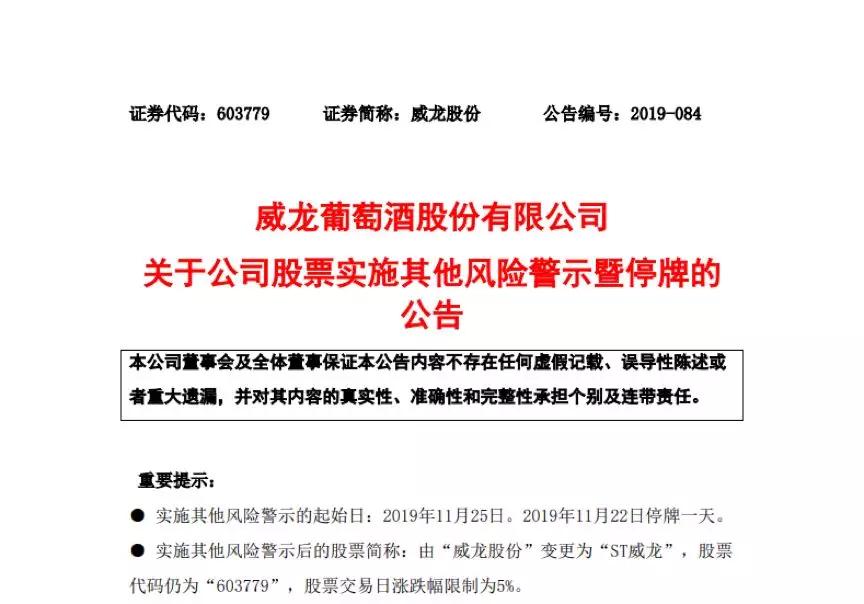 威龍股份發布公告稱,公司控股股東、實際控制人、董事長王珍海擅自以上市公司名義對外提供擔保,公司股票實施其他風險警示,2019年11月22日停牌一天。股票簡稱由“威龍股份”變更為“ST威龍”,股票代碼仍為“603779”,股票交易日漲跌幅也從10%限制為5%。