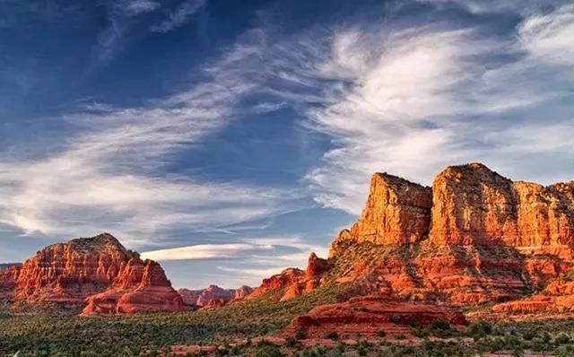 如上圖,夕陽的余暉,把山體染成了鮮艷的橙紅色,與大片的藍色天空和綠色樹林形成了鮮明的色彩、冷暖對比,十分富有韻味。