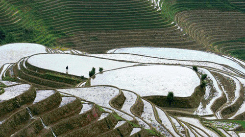 隨著朝陽逐漸爬上藍天,梯田中濃濃的水汽也慢慢化開,像是一滴白滴入了金的底色,在這精致的春景中一點點地蔓延開來,飄飄欲仙,美如仙境;