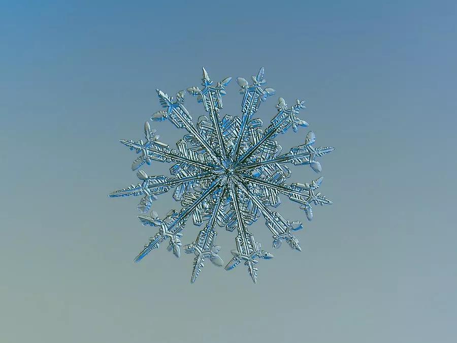在他的微距鏡頭下,紛紛揚揚的一場場雪被“拆碎”,形態(tài)各異的冰晶呈現(xiàn)出各式形狀規(guī)整、樣式精美的圖案,在讓人沉迷于雪花無限美麗與夢幻的同時,亦讓人不禁贊嘆大自然的神奇。