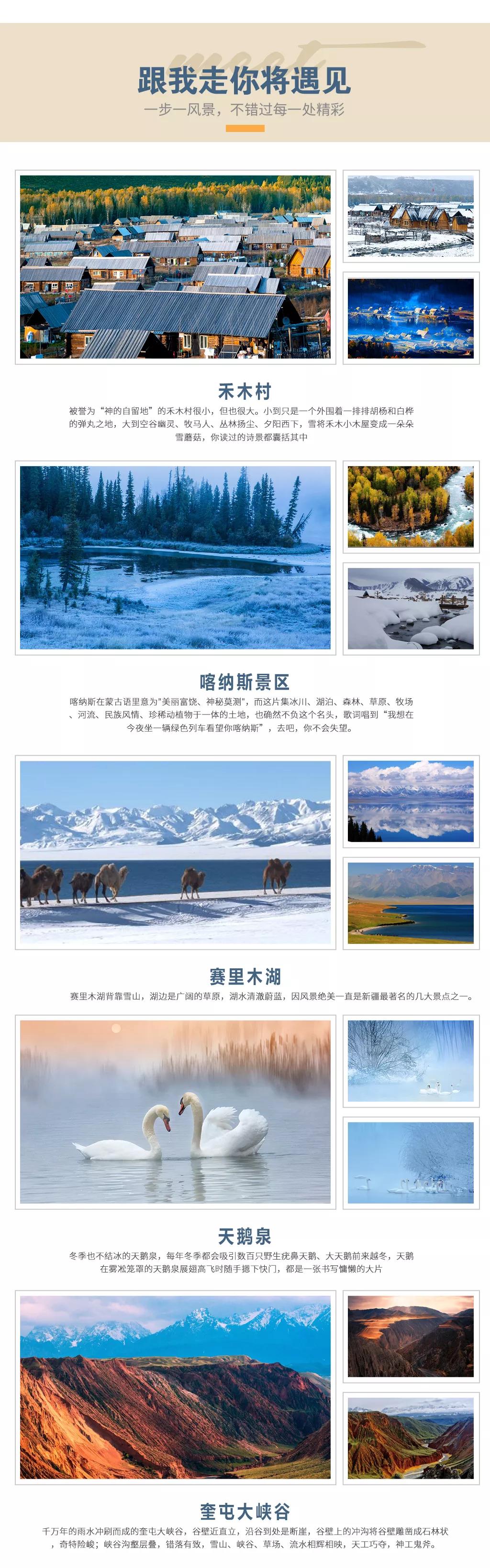 4、景區(qū)及小交通:費用包含門票以外的其它門票及小交通、娛樂項目需要游客自費,禾木冰雪樂園其它項目如單人雪地摩托、滑雪板、沖鋒舟、跳雪、雪地摩托車租憑等;