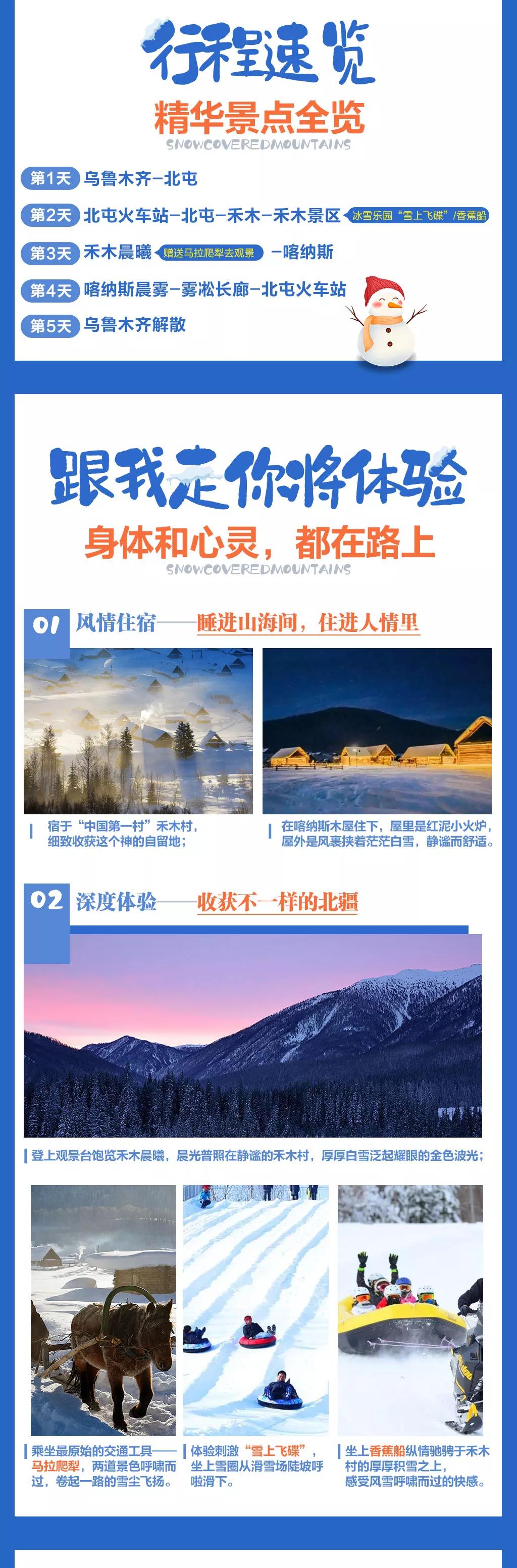 4. 贈送禾木村冰雪樂園中的滑雪或香薰船體驗,如游客想參加其它娛樂項目費用敬請自理。
