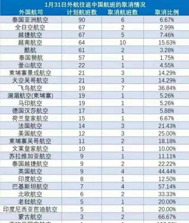 1月31日,120家國際航司計(jì)劃執(zhí)行1838個(gè)中國國際航班,其中28家航空公司共取消72個(gè)中國國際航班。