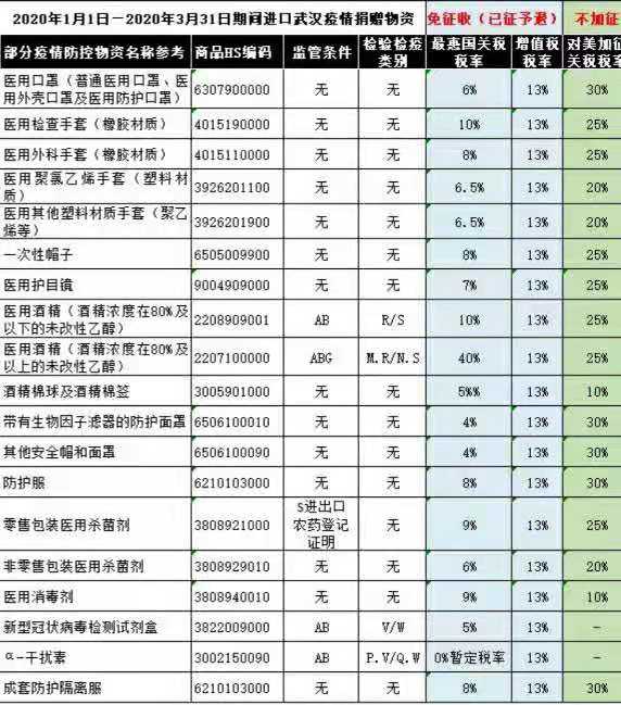 5、進(jìn)口且原產(chǎn)于美國的物資,不實(shí)施對美加征關(guān)稅措施,已加征稅款予以退還(2020.1.1-2020.3.31)。簡而言之,就是海關(guān)不僅為疫情物資開放綠色清關(guān)通道,還免所有進(jìn)口稅費(fèi)(企業(yè)自用或用于銷售的防護(hù)物資不適用“捐贈(zèng)物資”監(jiān)管方式,依然要繳納相關(guān)稅費(fèi))。
