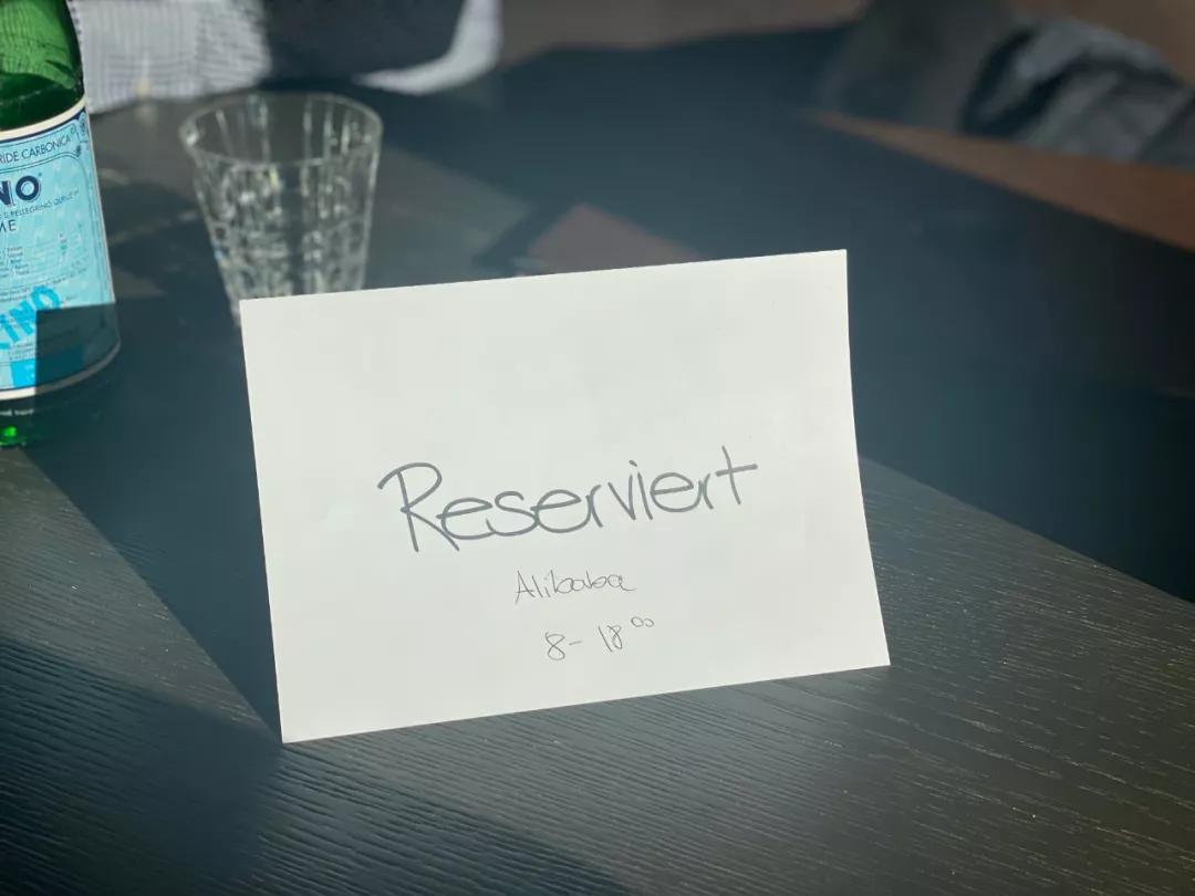 這是達(dá)沃斯小鎮(zhèn)離雪景名勝魔環(huán)山不遠(yuǎn)處一個餐廳里,一張小咖啡桌上貼著預(yù)定的標(biāo)簽。