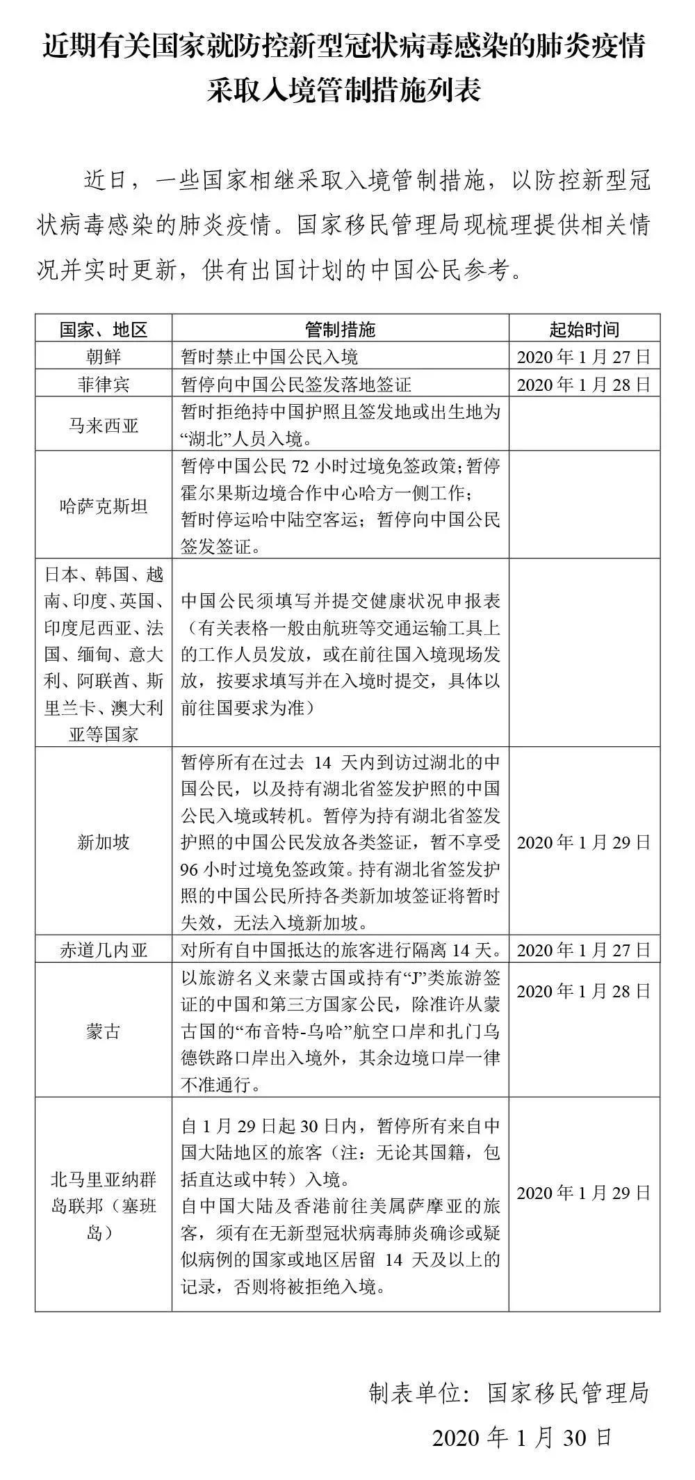 自1月24日起,任何來自中國或中國過境的旅客必須在不受新型冠狀病毒影響的國家停留至少14天,不足者拒絕入境。