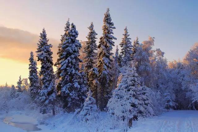樹木在大雪之下安靜地沉睡著,藍色的色調使其更 顯冰冷與安寧。忽然,一抹霞光闖了進來,畫面最 終表現出光影豐富、色調迷人的效果