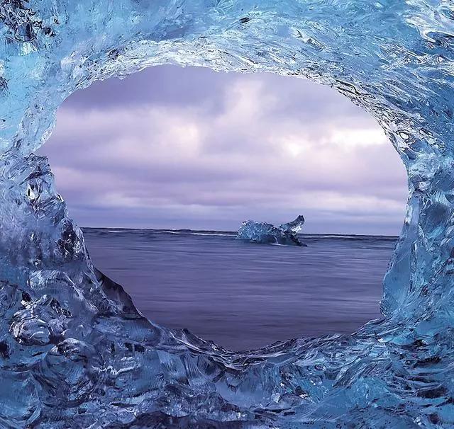 透過冰塊上這個畫框式的洞孔看到了局部的水面 和天空,水面上搖動的浮冰在低色溫下呈現出夢 幻般的藍紫色調,給人亦真亦幻的感覺