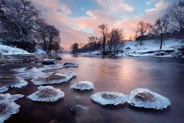 尚未落盡的晚霞照射在水面上,水面上結冰的石塊由大到 小、由遠及近地把畫面的空間感較好地表現出來,再加 上采用逆光拍攝,使岸邊的樹木呈現出迷人的剪影效果。攝影師只有具備了精湛的技術才能拍出這樣精彩的畫面