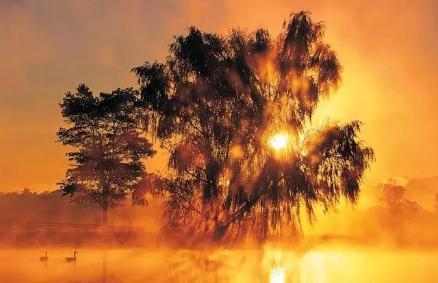 夕陽西下,萬物被霞光披上了一層紅色的光芒, 處處洋溢著熱情,逆光下樹木也被涂上了紅妝。水里的鴨子緩緩游弋,好一派生動、迷人的景象, 讓人不得不欽佩攝影師的創作能力