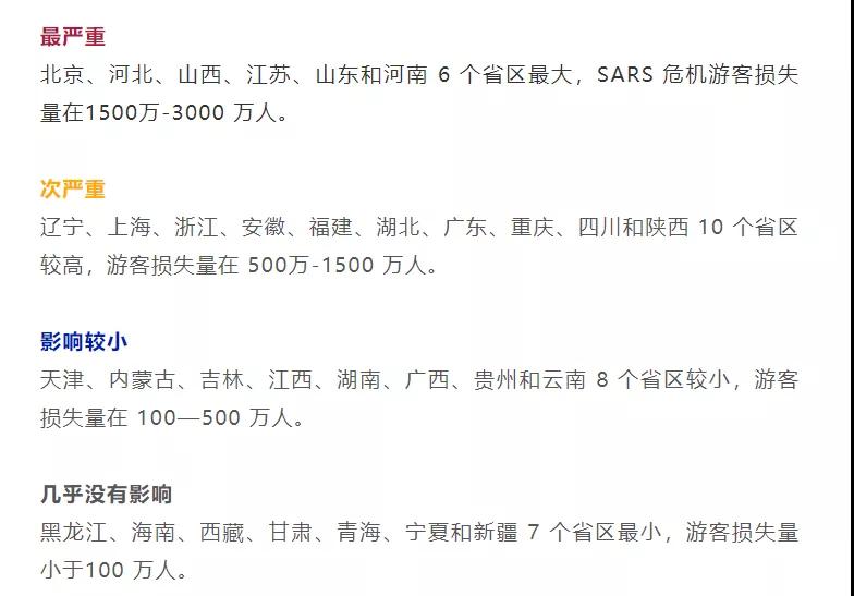 2003年SARS旅游業對不同地區造成不同級別的損失,北京、河北、山西、江蘇、山東和河南這6個省區最大。