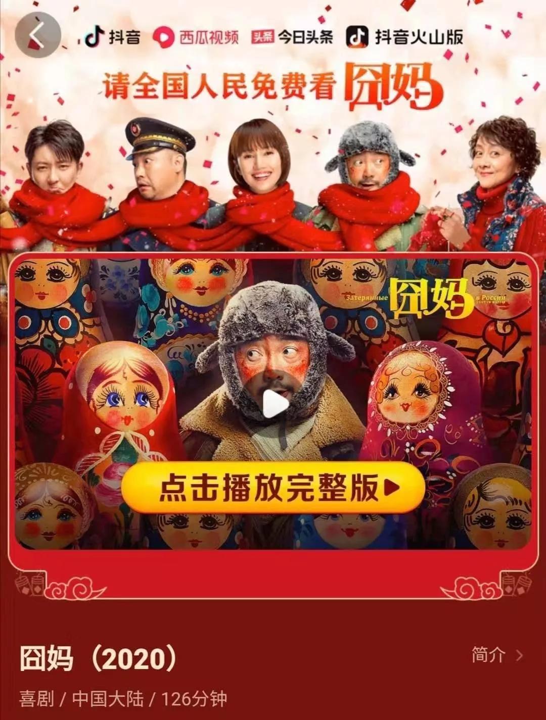 1月28日,字節跳動對外宣布,截至1月27日零時,電影《囧媽》在頭條系四大平臺(抖音、西瓜視頻、今日頭條、抖音火山版)及智能電視鮮時光三日總播放量超過6億,總觀看人次1.8億。統計顯示,2019年整個春節檔全部影片前三日的觀影人次為7378.1萬。