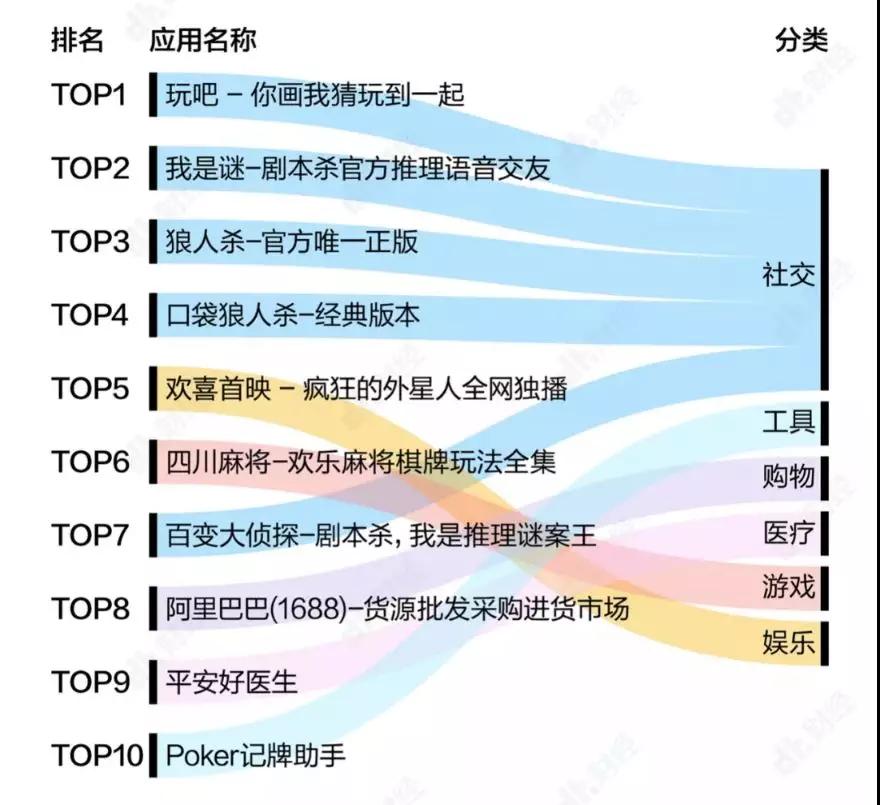 根據七麥數據,近七天下載量上升最多的1000個APP中有超過40%是游戲類應用。其中排名前四的是玩吧、我是謎、狼人殺、口袋狼人殺四個社交類游戲APP。