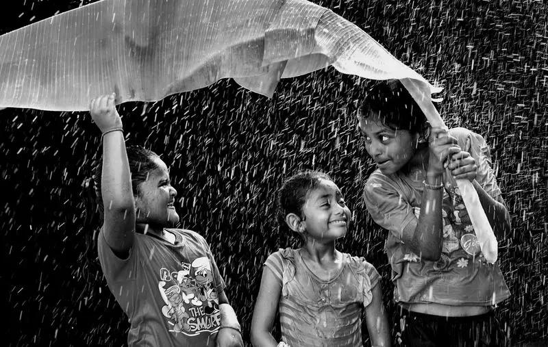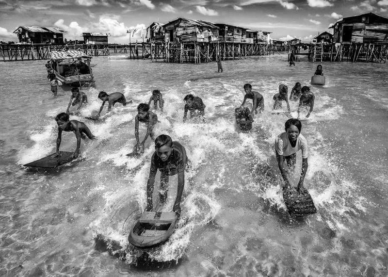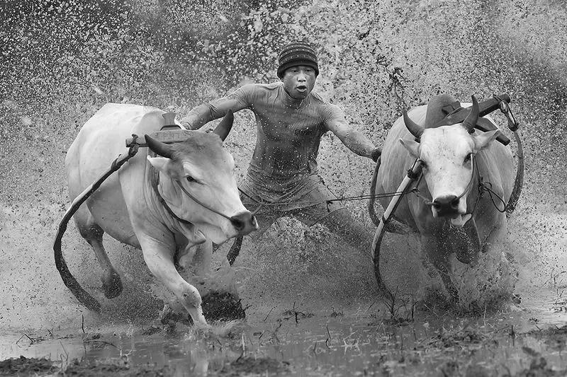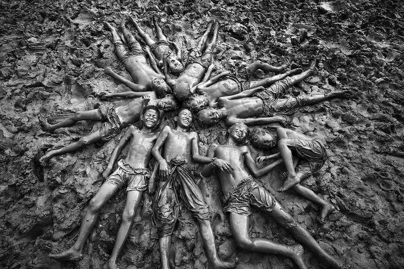 小孩拿著這個(gè)布袋在水里跳,躺在泥巴里面的這一個(gè)足球,還有泥巴中的奔牛,基本是屬于印尼的題材。所以這些照片基本很適合做低飽和度或者黑白,因?yàn)楫嬅嬗泻軓?qiáng)的影調(diào),而且動(dòng)感很足,所以很適合用黑白表現(xiàn)這些題材。