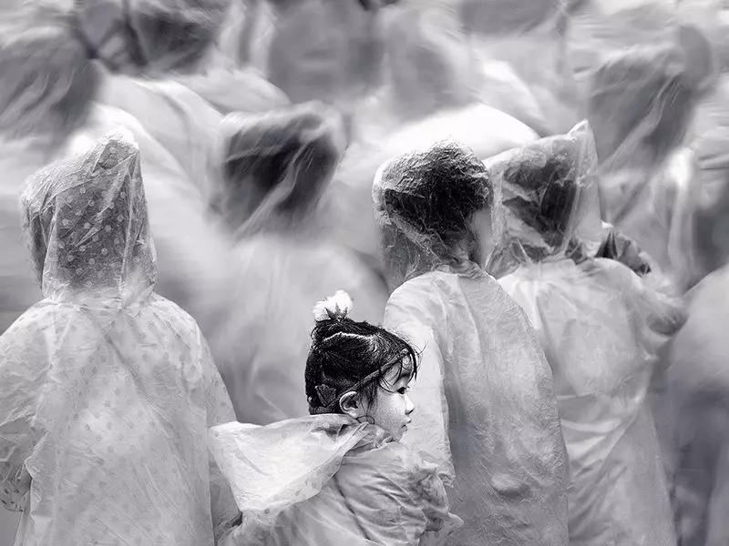 照片思路是利用了一些動(dòng)靜結(jié)合的手法,這樣的拍攝手法非常值得借鑒,比如在景區(qū),看到很多人都是帶著這種雨衣的時(shí)候,可以利用動(dòng)靜結(jié)合拍攝手法,利用1/4秒或者1/6秒這種快門去進(jìn)行拍攝。這個(gè)關(guān)鍵點(diǎn)就是他這個(gè)雨衣要統(tǒng)一,通過干凈的畫面柔和突出這個(gè)主體---小孩,如果說這個(gè)小孩,她是穿著其他衣服跟這個(gè)雨衣的白色形成對比也是一種思路。