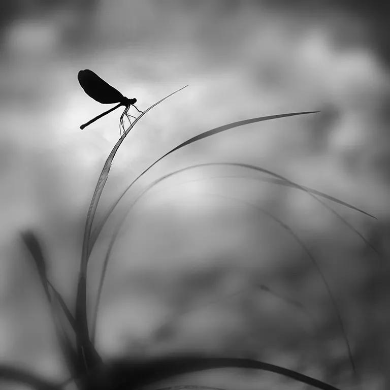 照片的意境非常好,利用了這個(gè)長焦,虛化,得到一個(gè)干凈背景,然后做成黑白之后跟這個(gè)蜻蜓剪影形成一個(gè)反差,這種淡雅的黑白呢,意境還是不錯(cuò)的,所以,我覺得在接下來六七月份的這個(gè)夏天,如果所有條件大家再拍荷花,拍蜻蜓的時(shí)候,可以借鑒這樣的影調(diào)手法。