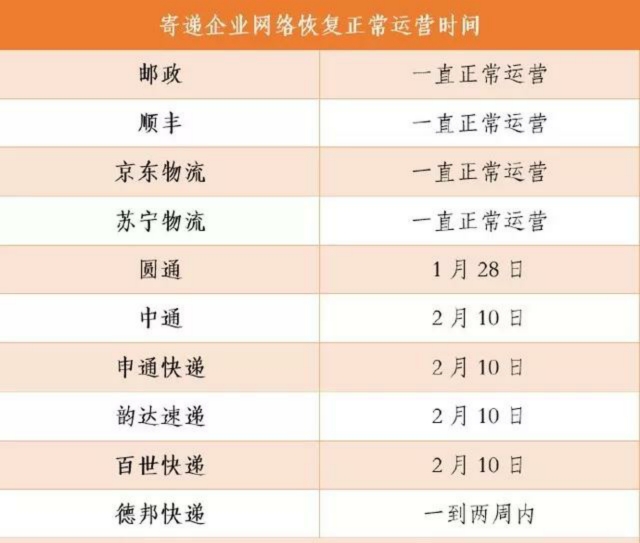 2020年2月10日消息,今日國(guó)家郵政局發(fā)布官方消息稱(chēng)快遞公司全面復(fù)工,該公告公布了各大快遞物流公司復(fù)工時(shí)間表。