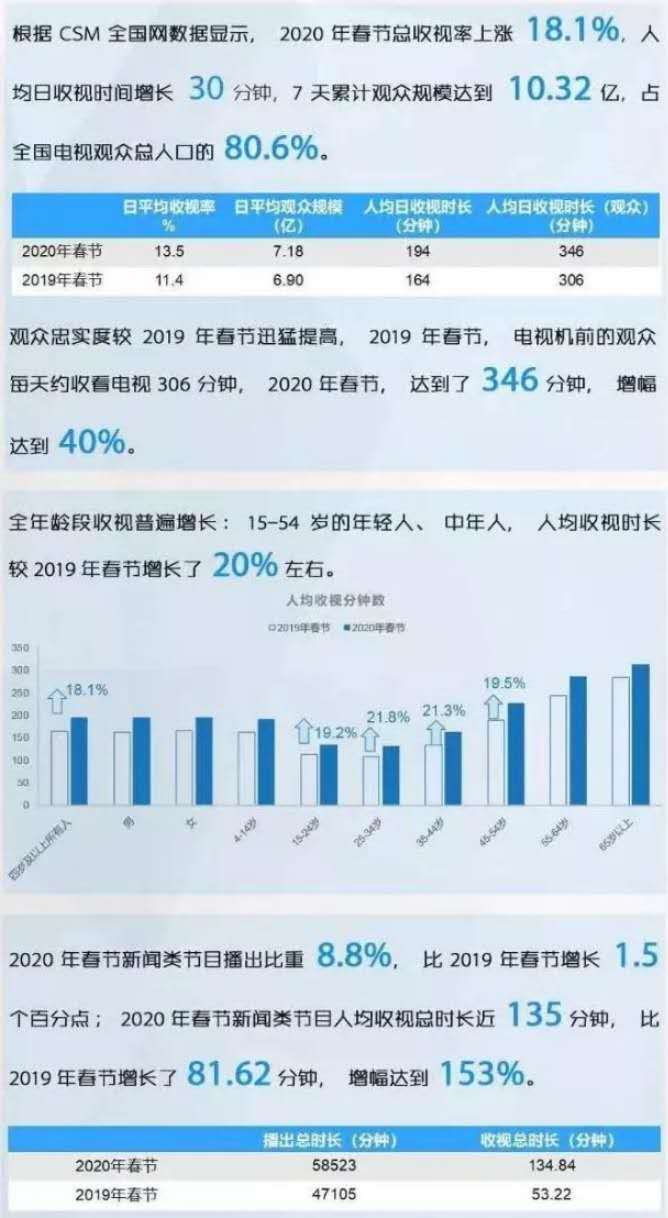足不出戶、居家過年成為2020年全國(guó)人民的春節(jié)度假模式,電視再次彰顯出強(qiáng)者的力量。觀眾忠實(shí)度較2019年春節(jié)迅猛提高,2019年春節(jié),電視機(jī)前的觀眾每天約收看電視306分鐘,2020年春節(jié),達(dá)到了346分鐘,增幅達(dá)到40%。