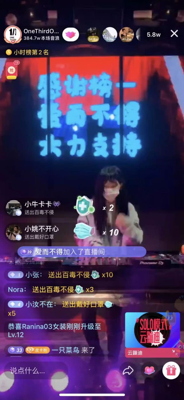 2月9日,ONETHIRD在抖音開設了云銳舞直播。從晚上9點到次日凌晨2點,累計在線人數超過 121.3 萬人,收獲打賞近200萬元人民幣。TAXX和ONETHIRD兩大最強夜店的線上“battle”, 夜店常客和電音愛好者喜聞樂見。有人甚至在朋友圈揣測:一場打賞在70-100萬,比線下盈利還要多。