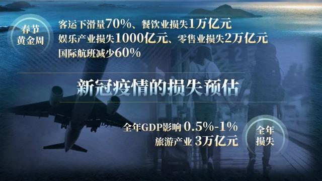 2019年大年初一,內(nèi)地電影票房為14億元,今年僅為140萬(wàn)元。除此之外,今年的春節(jié)黃金周,春運(yùn)客運(yùn)量下滑70%,娛樂(lè)行業(yè)損失1000億,餐飲行業(yè)損失1萬(wàn)億,零售業(yè)損失2萬(wàn)億,國(guó)際航運(yùn)減少60%。