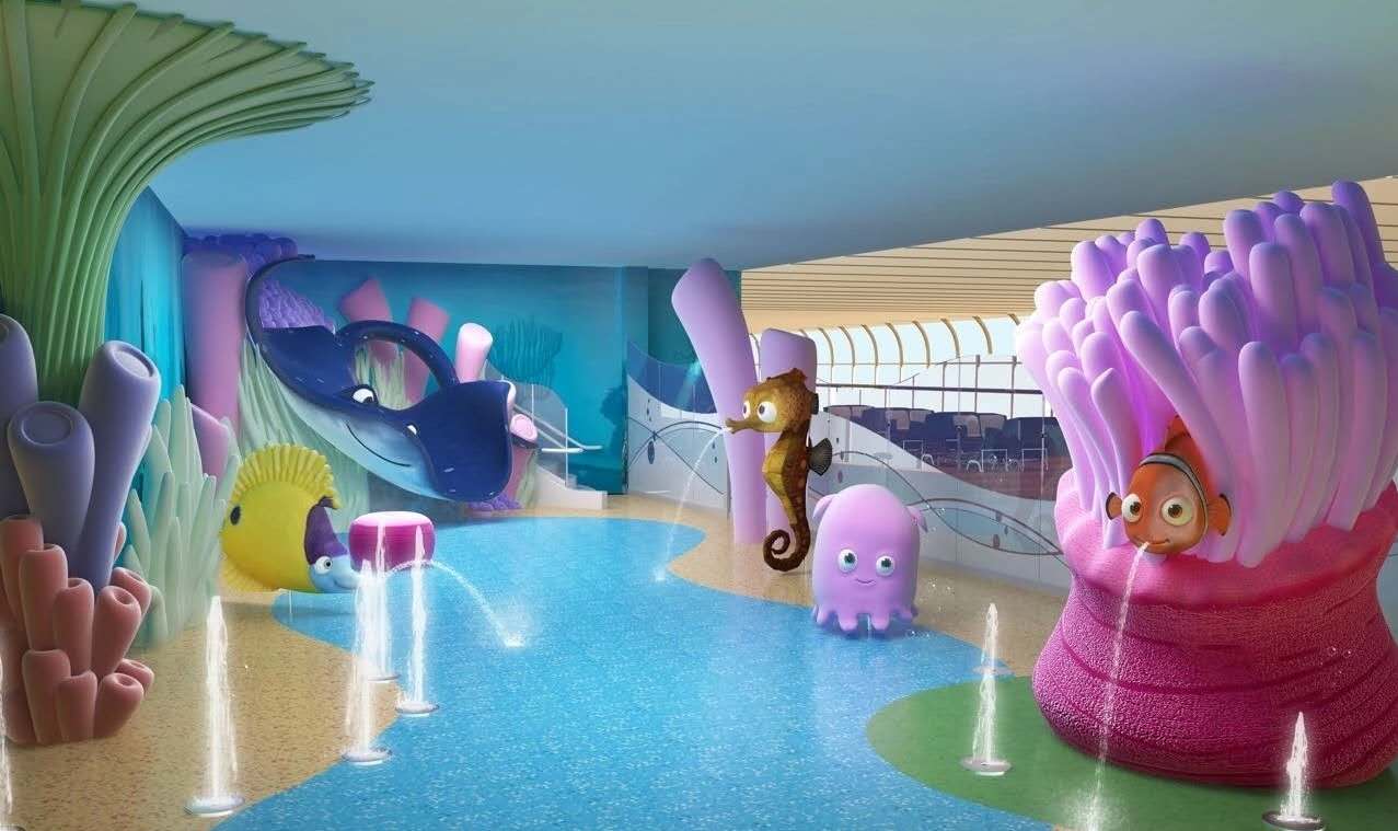 孩子們可以在尼莫(小丑魚)的珊瑚礁海灘上休息一下,這是由玻璃圍墻包圍,1500平方英尺,柔軟的濕甲板表面區(qū)域的完美的海灘,迷你水游戲區(qū),一個有趣的水上樂園,里面有迪斯尼電影《海底總動員》里的水下角色。
