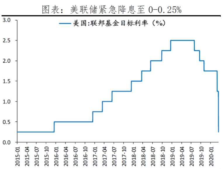 繼3月3日緊急降息0.5個百分點之后,3月15日美聯儲再次宣布將聯邦基金目標利率下調1個百分點至0-0.25%的區間,并啟動7000億美元的量化寬松計劃。此外,美聯儲宣布將貼現窗口利率下調1.5個百分點至0.25%,提供日內信貸支持,鼓勵銀行使用資本和流動性緩沖,將法定存款準備金率降至0。