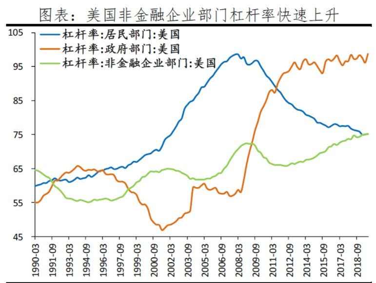 2008年金融危機后,美國居民部門修復破損的資產負債表,杠桿率(債務/GDP)持續下降;政府部門加強宏觀逆周期調節、承接私人部門杠桿轉移,杠桿率快速攀升,但2014年后基本平穩;非金融企業部門受危機沖擊去杠桿,但杠桿率快速反彈,超過危機前水平,目前更是超過居民部門。