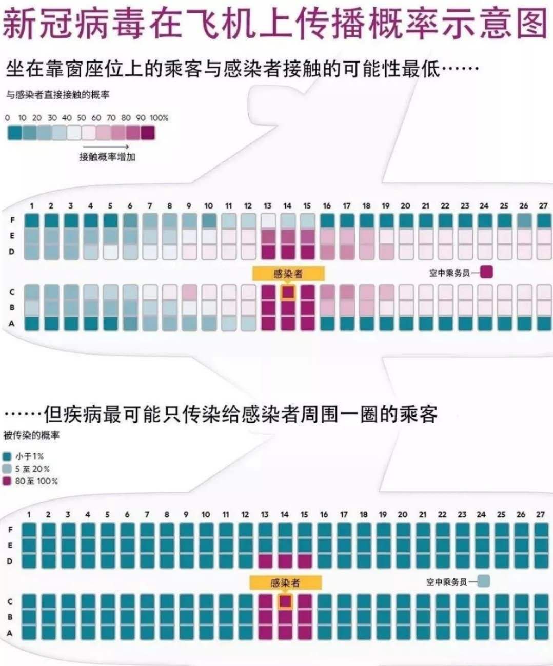 對于其他位置的乘客,危險(xiǎn)性并不顯著,這是由于客艙空氣在橫斷面上循環(huán),飛沫的播散被限制在少數(shù)幾排座位。