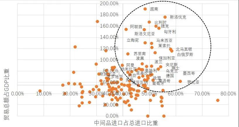 我們計算了世界各國中間品進口額占總進口額的比重、從中國進口的中間品占其全部中間品進口的比重以及各國貿易總額占GDP的比重。如果一國的前兩個指標比較高,則說明該國對中國的中間品進口有較高的依賴度。在此基礎上,若該國同時擁有較高的對外貿易依存度,則說明該國的整體經濟對中國進口的依賴程度更高,進而表明該國在此次新冠疫情中會受到較大沖擊。