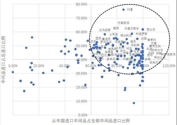 我們試圖從另一個角度,更為直接地測度新冠疫情對全球供應鏈帶來的供給沖擊。我們的研究思路是:通過原始而真實的國際貿易數據,找出那些更容易受到中國沖擊的國家。這些國家進口了更多的中國產品,尤其是中間產品。進口中間品的目的是進入國內的生產環節,顯然對該國生產的影響更為直接。找到了這些更容易受到沖擊的國家之后,我們就可以根據這些國家的分布和規模,判斷新冠疫情對全球供應鏈帶來的供給沖擊。