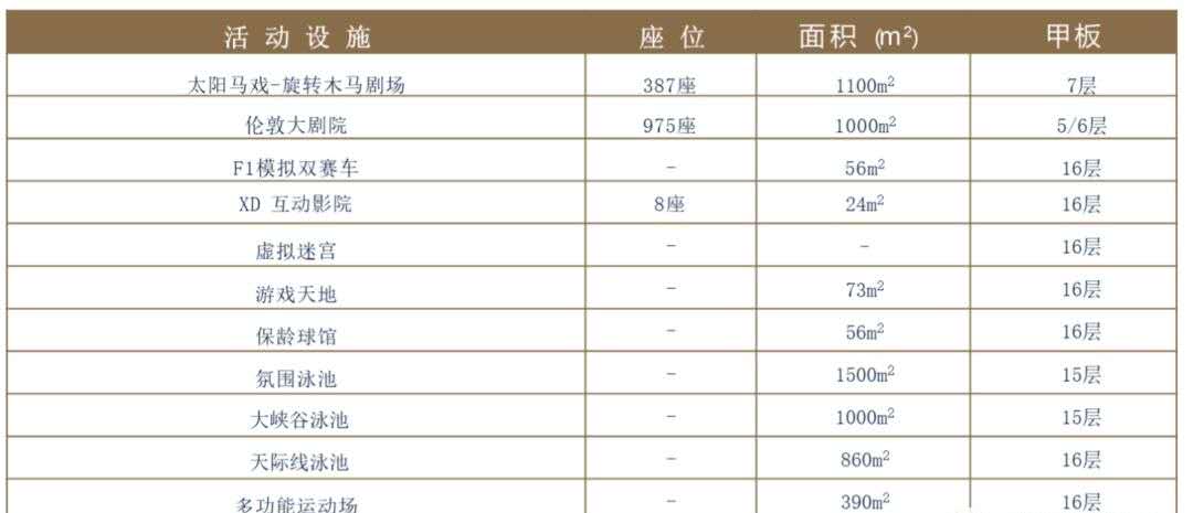 在意大利知名兒童品牌智高(CHICCO)細(xì)心安全的設(shè)施和目不暇接的可愛玩具中,3 歲以下的寶 寶盡情探索童真的小宇宙;3-11 歲的寶貝能再繽紛的樂高(LEGO)海上樂園中組裝自己的海上城堡,12-17 歲的青少年更設(shè)有各種球類運(yùn)動(dòng)兼容的多功能運(yùn)動(dòng)場(chǎng)、82 米喜馬拉雅滑水道和 F1 模擬 賽車等,讓青春期的小大人在高端安全的空間中自在冒險(xiǎn)。