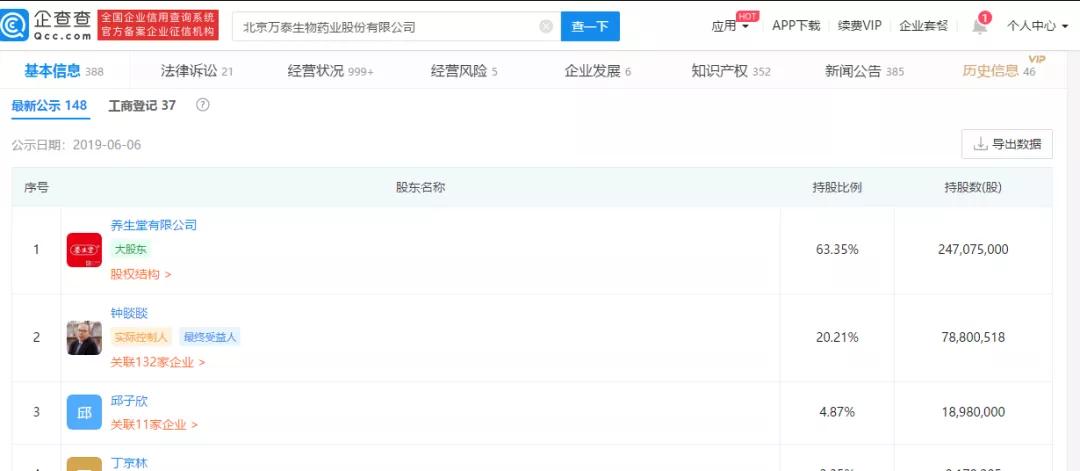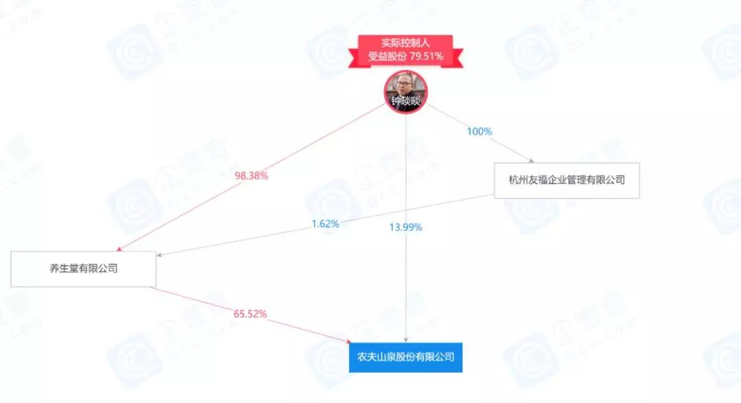 根據企查查資料顯示,鐘睒睒名下的養生堂,有一家名為萬泰生物的公司,從萬泰生物招股書可以了解到,農夫山泉的大股東養生堂持股 65.5223%、鐘睒睒持股 13.9937%、其他股東持股 20.4840%。養生堂是核心的控股型平臺公司,鐘睒睒持股98.38%,另外通過其全資控股的杭州友福持有1.62%股權,也就是說,養生堂由鐘睒睒100%控股。