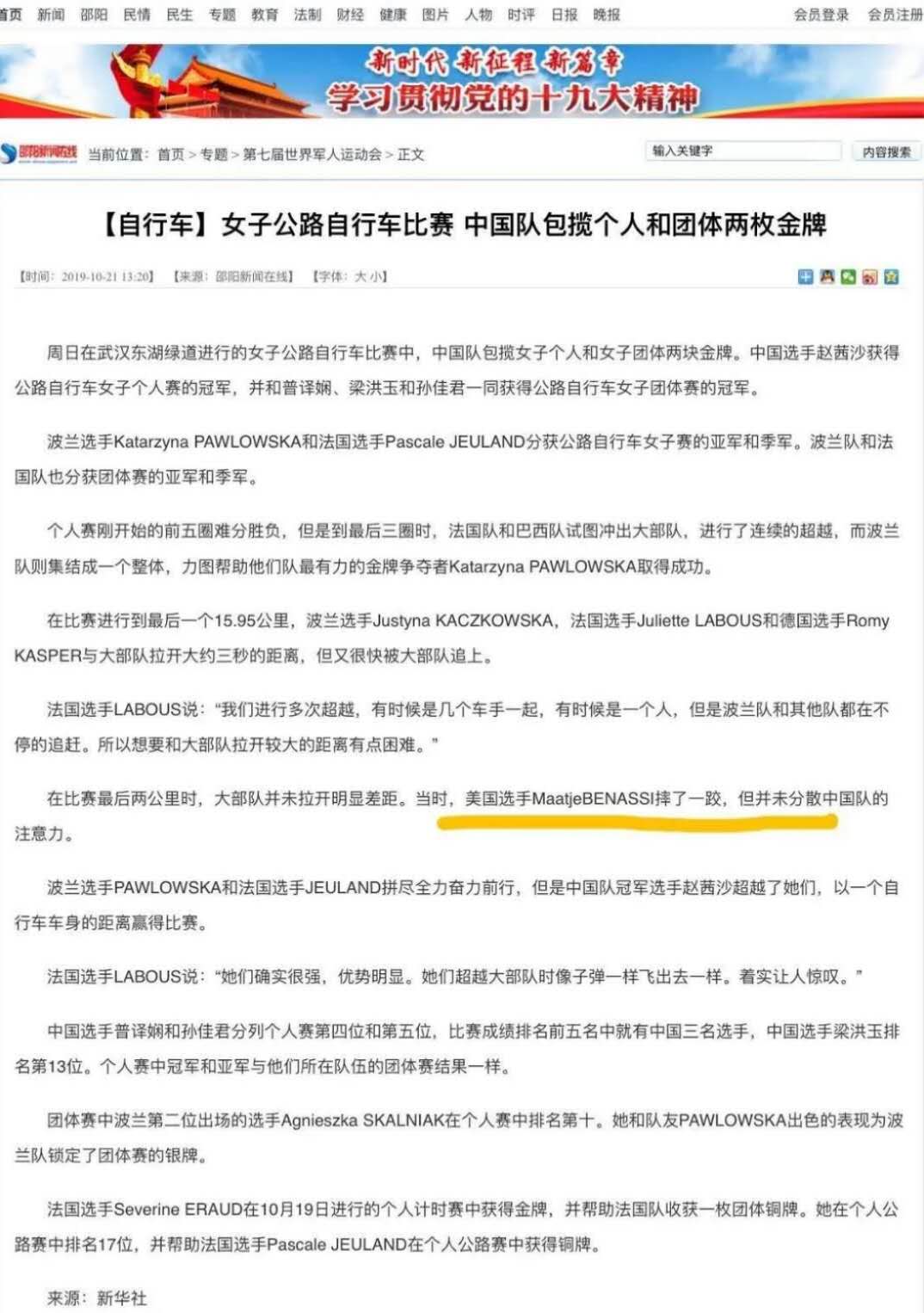 Maatje Benassi 有個親戚Matthew Benassi在發(fā)生泄露事故的美軍生化武器實驗室Fort Detrick工作。她去年10月作為女子公路自行車運動員參加了武漢軍運會,她是10月21日進行比賽的。