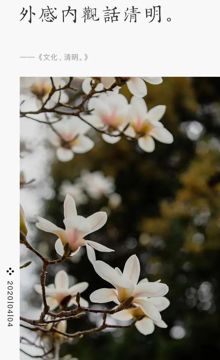 清明,我們又一次進入化文的狀態(tài)。細雨紛紛,煙柳垂淚,行人斷魂,是對逝者的緬懷和尊敬;萬物生長,惠風和暢,天清地明,是對生者的祝福和期待;萬物有靈,春發(fā)幾枝,懵懂初醒,是對靈者的啟示和生發(fā)……