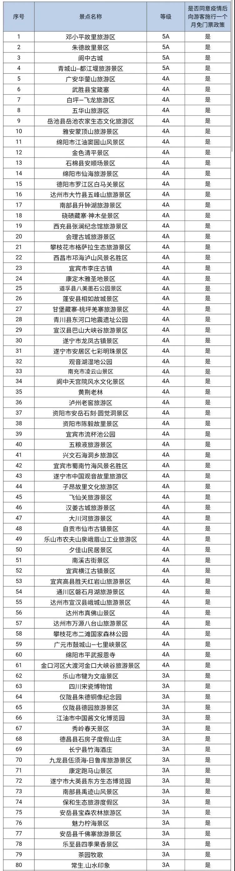 4月1日,四川省旅游景區協會公布,全省112個景區在4月對所有游客免門票!實行免費景區名單如下: