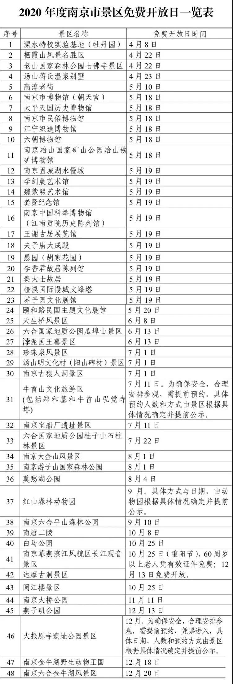今年,南京共有48家旅游景點限時免費開放,包括棲霞山、朝天宮、六朝博物館、南京中國科舉博物館、胡家花園……實行免費景區名單如下: