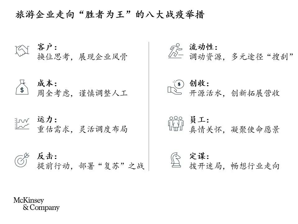 麥肯錫結合自身在旅游行業的豐富咨詢經驗,以及過去幾周的重點調查研究,總結出針對旅游企業的八大戰“疫”舉措。這些舉措詳細闡明了克服短期現金流危機的方法,以及企業應在恢復期中如何謀篇布局,希望能為廣大旅游企業提供一些參考,并與全行業共勉。