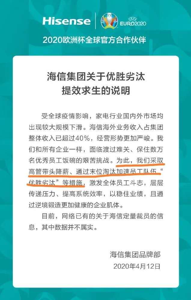 海信集團采取高管帶頭降薪、通過末位淘汰加速員工隊伍“優勝劣汰”等措施,激發全體員工斗志,層層傳遞壓力、提高系統效率,以穩住業績,且通過逆境鍛造更加健康的企業肌體。”