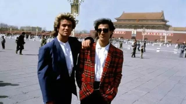 1985年,第一支來中國演出的西方搖滾樂隊Wham!在天安門前合影