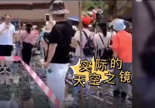 小小區(qū)域,玻璃搭建出一個簡陋場景,模擬天空倒影效果。游客過多導致玻璃被踩的臟亂,現(xiàn)場秩序混亂。游客紛紛抱怨,根本拍不出“天空之鏡”的效果照片,景區(qū)如此不走心的項目,簡直就是拿人開涮。