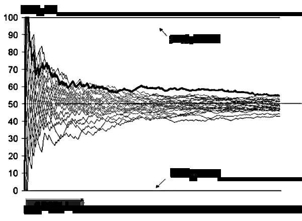 還是以擲硬幣為例,當投擲次數足夠大時,出現正(反)面的頻率將逐漸接近于1/2,且隨著投擲次數的增加,偏差會越來越小,如下圖。這是最早發現的大數定律之一。