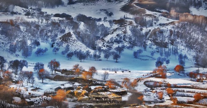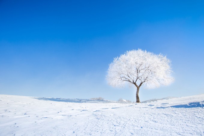 冬季的烏蘭布統(tǒng)儼然是一個白雪皚皚,銀裝素裹的冰雪童話世界,越野車進(jìn)入塞罕壩森林公園時,道路兩邊都是鱗次櫛比的筆直的參天大樹(估計是松柏類),白茫茫的一片,甚至有幸一睹雪白的狐貍,或許是太冷了外出覓食,但是并沒有停留很久就不見了蹤跡,讓人懷疑是否出現(xiàn)過。這里沒有雪鄉(xiāng)著名的冰雪蘑菇屋,但這里有小河頭的雪饅頭;這里沒有哈爾濱五彩繽紛的冰雕王國,但這里有小巧精致的冰燈。這里的霧凇甚至比我12年在霧凇島看到的都要壯觀,唯美。