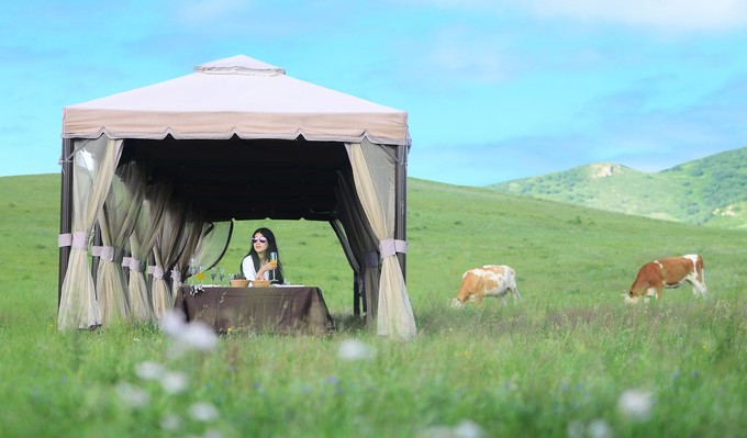 閉上眼睛,思緒飄向遙遠(yuǎn)的內(nèi)蒙壩上草原,在蒼茫的草原之上,精致的帷幔,浪漫的輕紗,香檳美酒,可口果盤,美味餐包,手抓羊肉……觥籌交錯間的歡聲笑語一直縈繞在我心頭,回來之后依然會想起那個詩畫般的夢境,久久不能忘懷。去壩上草原之前,我從來沒有想過可以在大草原感受一次高逼格冷餐會,不再是水泥堆砌的四方格子,不再是吵吵嚷嚷的餐廳,一同舉杯,敬藍(lán)天白云,敬蒼茫草原,敬身邊這些可愛的人兒。