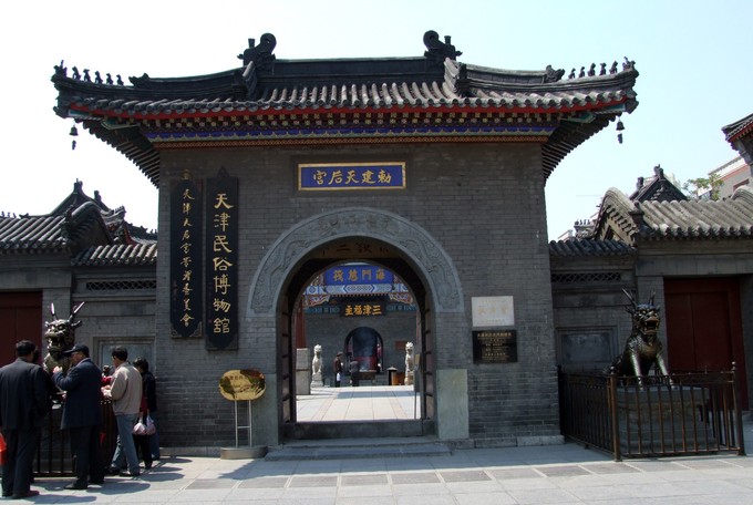 天后宮位于古文化街中心,也是古文化街古跡的核心,祭祀保佑出海遠航平安的天后娘娘,已有600余年歷史。現在是天津民俗博物館的所在地,館內介紹了天津城歷史、民俗,陳列著明代天津城磚、清代漕運模型、清代水機等文物。