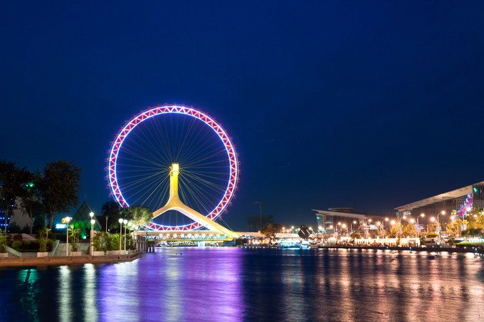 天津之眼坐落在天津市紅橋區海河畔,是一座跨河建設、橋輪合一的摩天輪,兼具觀光和交通功用。摩天輪旋轉一周所需時間為28分鐘,到達最高處時,周邊景色一覽無余,甚至能看到方圓40公里以內的景致。直徑為110米,輪外裝掛48個360度透明座艙,每個座艙可乘坐8個人,可同時供384個人觀光。轉動速度緩慢,并不刺激。你可眼見車輛從兩邊疾馳而過,別有妙趣。