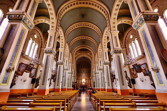 教堂外部用紅黃相間花磚砌成,三座呈品字形排列、高聳入云的塔樓上浮蓋著綠色銅片,塔樓頂上各有一個青銅十字架。走進教堂,映入眼簾的首先是湖藍、白色、淡黃構成的內部主色調,給人一種清新的感覺,14根立柱從門口排列到祭臺。教堂四周列著一座座精美的教徒銅像,墻壁上則掛著一幅幅記述耶穌受難故事的油畫,教堂內還有圣母、耶穌、天使等的彩色塑像。
