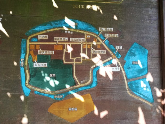 村口的全莊地圖,推薦停車在莊門,莊門進(jìn)莊門出,幸存古屋集中在中心巷道東側(cè),南邊主要是花田。