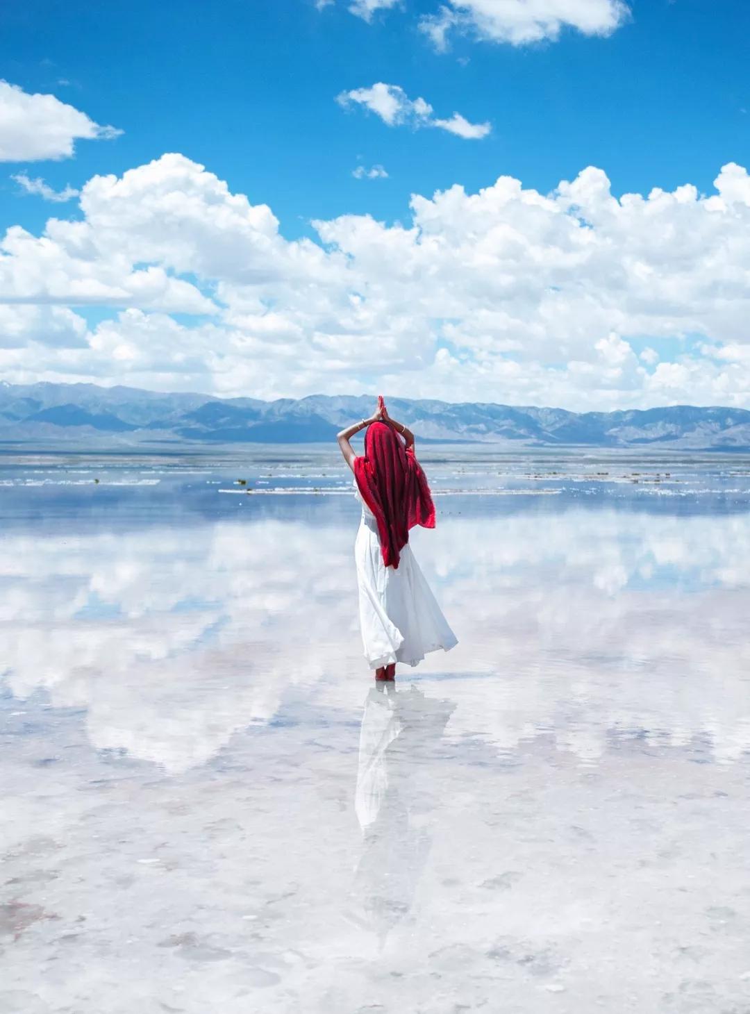 隨后我們來到炙手可熱的“天空之境”茶卡鹽湖,【茶卡鹽湖】被國家旅游地理雜志評為“人一生必去的55個地方”之一。這里的采鹽歷史非常悠久,湖水含鹽量很大,湖面上會自然結晶,一片純白。結晶之上是一層薄薄的露水,將天空、云朵和對岸的山都倒映在白色的湖里,非常漂亮,所以也被稱為“中國的天空之境”。大家可以乘坐景區內的小火車前往景區深處游玩,如果不乘坐小火車,沿著鐵軌向湖深處散散步拍拍照片也是非常愜意的。