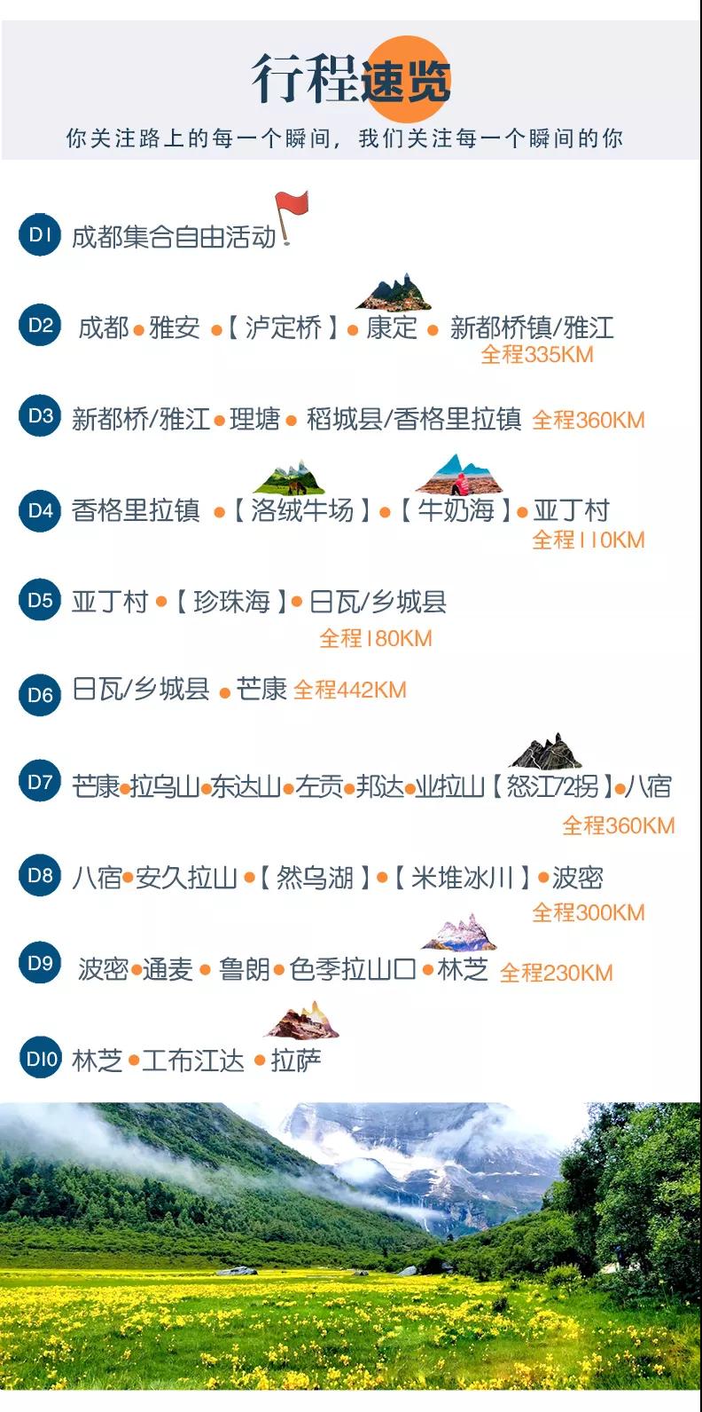 新都橋/雅江 — 天路十八彎 — 理塘 — 兔兒山 —稻城縣/香格里拉鎮(全程360km)
