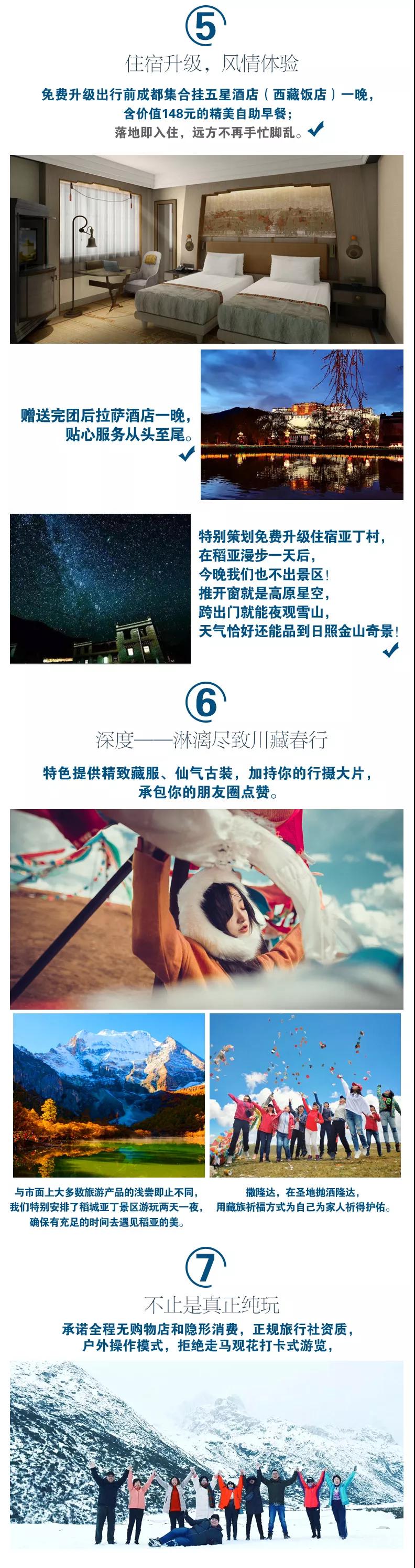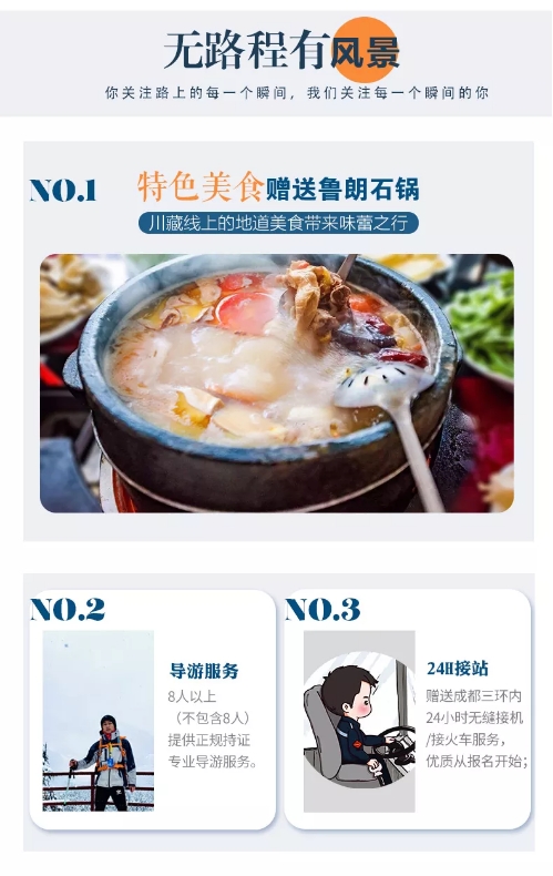 6、贈送:贈送魯朗石鍋雞,地道川藏美食(另外點菜需游客自行支付);贈送戶外禮包旅游三寶、魔術頭巾、礦泉水;贈送提供精致藏服、仙氣古裝,加持你的行攝大片;贈送成都24小時專車接機接站服務,給你最貼心的旅程。(贈送項目不用費用不退)